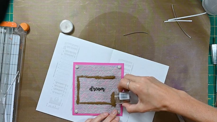 And now the fun part! Let's start embossing! I'm using a gold embossing powder for this one. Just sprinkle some powder on top of the adhesive. Make sure you cover everything to fill the box shape.